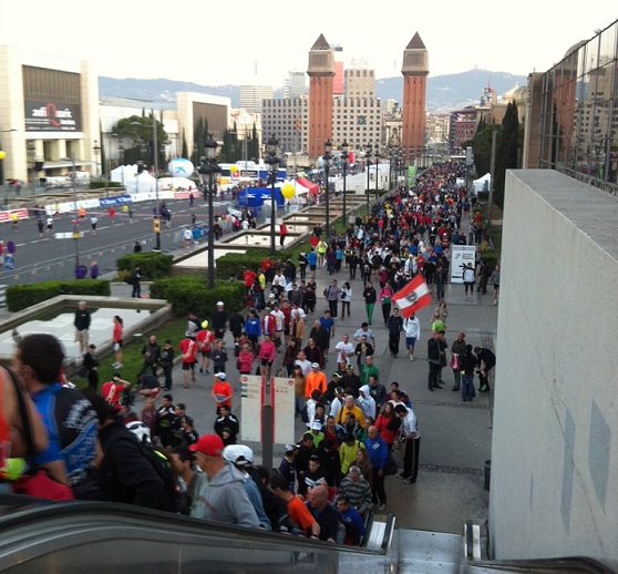 Llegamos allí y vemos que hay un ambientazo!!! Empezamos a ver los runners de todo el mundo que han venido a correr nuestro maraton. Hay de todo… Disfrazados, descalzos, tapados con bolsas de plastico para no coger frío antes de la salida, pero lo que hay de verdad es muchisima gente. La música, la gente, todo el ambiente en general hace que me emocione… Llevo unos días especialmente sensible… No se si será una premonición de lo que viene…