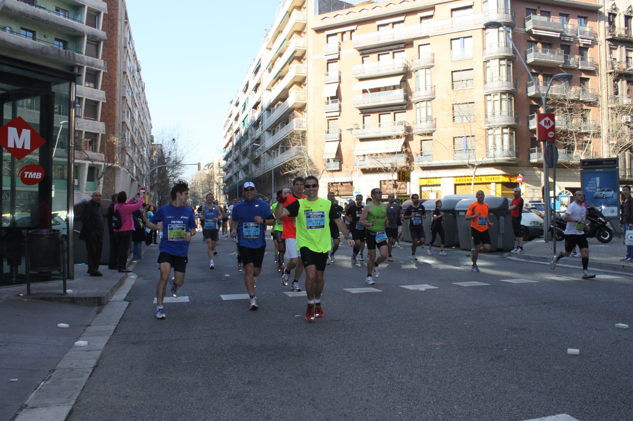 Nosotros salimos a las 8’35 horas. Empezamos a correr llevados por la multitud, vigilando el reloj para no pasarnos de ritmo, que es un problema habitual que tenemos Jose y yo… El ritmo de 5’40 me resulta cómodo, pero es que acabamos de empezar. Empezamos a tirar por la calle Tarragona con la ligera subida. Ahora no es un problema. La subida hasta Diagonal si se hace notar un poco mas, y nos hace conscientes de la pendiente que tiene Diagonal en direccion hacia la salida de Barcelona.