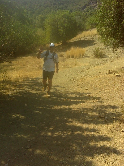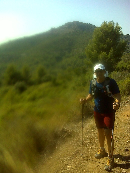 En las bajadas Ivan cumplió con lo que decía. Bajaba rápido, muy rápido. Yo no podía seguirle, entre el miedo a fastidiarme otra vez, y que aun no estoy al 100%. No me puse los calcetines compresores, y la verdad es que no sentí prácticamente molestias. En alguna bajada me dejé llevar y llegamos a ir por debajo de 5, esquivando piedras, agujeros, troncos y demás obstáculos. A medio camino un gel, y durante todo el recorrido mucha agua. Tanta como los 1,5 litros que caben en la mochila Salomon que compramos para la IDM.