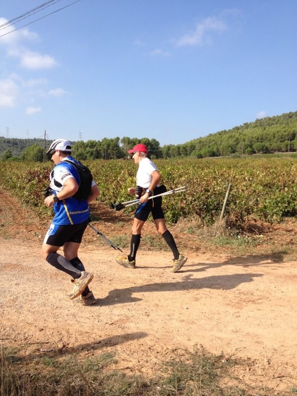 La subida a Sant Ramon se me hace más suave que cuando la hicimos con el resto del team hace tres semanas. Subimos por otro camino y se me hace mas llevadero. Eso si, muy duro igualmente, no nos engañemos. La bajada por el mismo sitio de siempre. Bajo andando para no castigar las rodillas, y me ayudo de los palos para no cargar los cuadriceps. Por cierto, que gran invento los palos… Sin ellos no hubiera podido acabar casi seguro. Un gran apoyo en las subidas, y una gran ayuda en las bajadas. Ayudan a que las piernas no se carguen tanto repartiendo el peso entre ellos.
