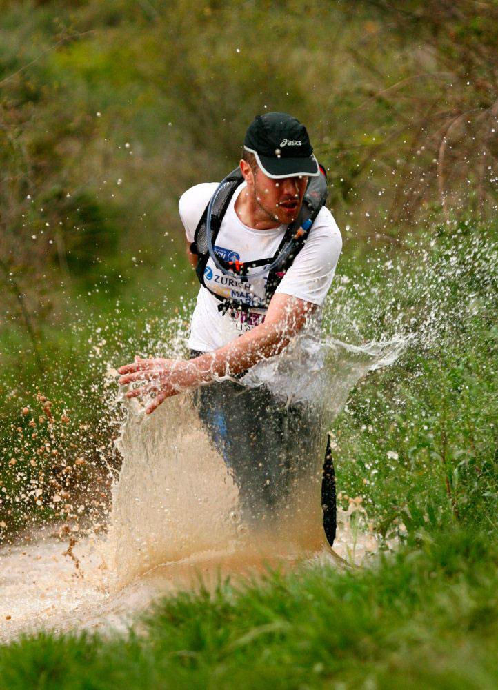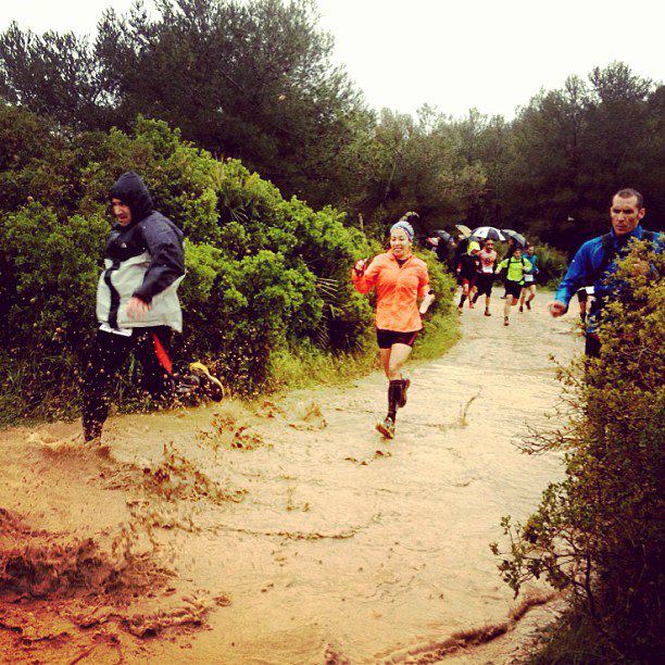 La carrera empieza subiendo, durante unos 7 kilómetros en los que pasamos de una altura a nivel del mar, a unos 250 metros. En cuanto cogemos los caminos de tierra, vemos claramente cual va a ser el compañero durante todo el recorrido: el barro. Lo peor es que como delante va mucha gente, el terreno esta ya impracticable… Resbalones, caídas, charcos en los que el pie se cubre totalmente hasta media pantorrilla… En este tramo inicial, cuando llevamos unos 4 o 5 kilómetros (o tal vez menos), nos encontramos con el primer «tapón». Un «corriol» o riera en el que hay que ir de uno en uno y claro, 2000 runners a la vez por ese camino… El tramo acaba en una subida de piedras que ayuda a estirar un poco la carrera.