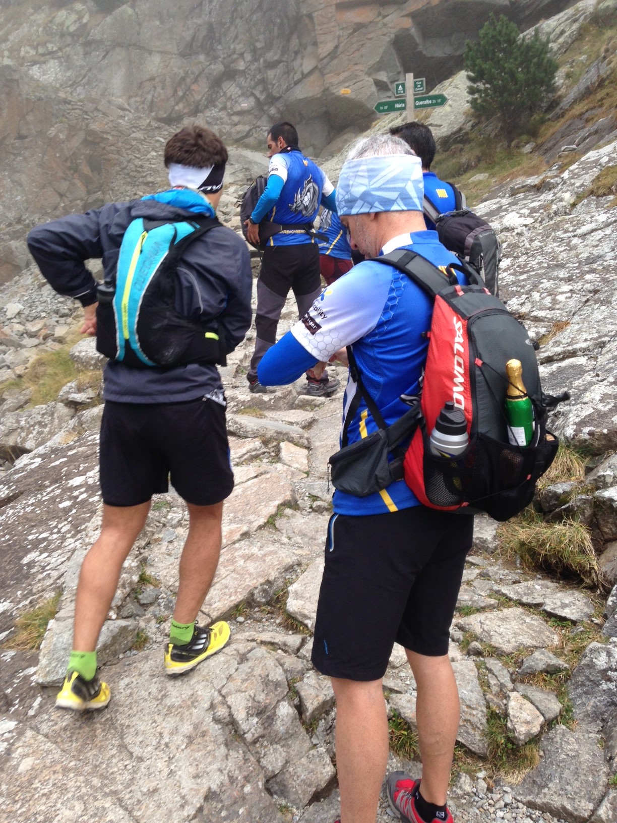 El letrero que marca las direcciones nos recuerda que estamos a 2:15h de Queralbs, y nosotros hemos necesitado 1:30h. Parece que vamos bien. Eso lo creímos hasta que nos paso un trailrunner a un ritmo alegre. Vaya máquinas hay por ahí. Seguro que era un “residente” que se conoce bien la zona. Hay que reconocer que el camino está muy bien señalizado.