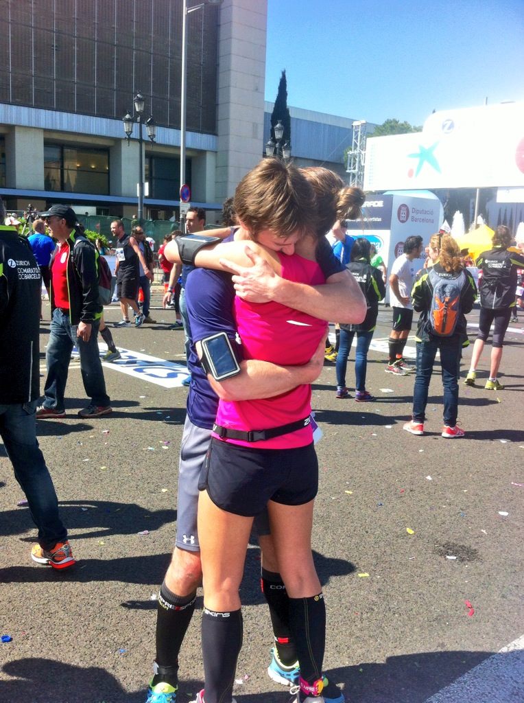 Pero el maratón no es solo 42 kilómetros a 5:35 o al ritmo que sea. No lo es. El maratón es lo que no ha salido en las noticias. El maratón son las lágrimas que esa chica derramaba al cruzar la meta de la mano de su pareja. Es ese chaval que se para y al que otro le dice que no se pare, que continúe. Es que te duele el alma en el kilómetro 29 pero no te paras… continuas aunque sea caminando porque solo te faltan 13 kilómetros para conseguirlo. El maratón es ese momento en la Av. Paral.lel en el que ves a alguien conocido que te anima como si la vida le fuera en ello. O a alguien desconocido que grita el nombre que puede leer en tu dorsal, porque la velocidad de tu zancada es tan lenta que le permitiría leer un capítulo de Juego de Tronos si lo escribieras en el dorsal.