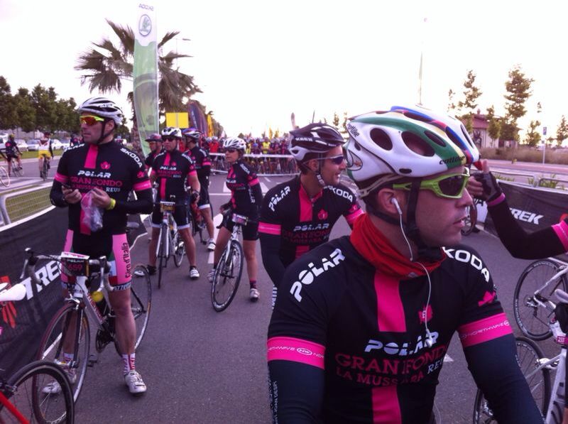 A las 5 suena el despertador y nos ponemos en marcha. Vamos a desayunar cerca del hotel, ya que a esas horas el hotel todavía no pone desayuno. Bocata, cafe, croissant… Y a la zona de la salida. Tengo que localizar a Judith para que me deje el casco y tenemos que irnos al cajón de salida. La carrera empieza a las 7:30 horas. En la salida hay nervios. Y es que salir tantas bicis juntas es peligroso. Toques, gente que se cruza, empujones, caídas. La tensión (ahora sí) se palpa. Gente gritándose, intentando adelantar como si les fuera la vida en ello. En una de las rotondas saliendo de Reus vemos la primera caída. Dos chicos que se han tocado y se han ido al suelo. Ha sido tres o cuatro bicis por delante nuestro. La teoría era ir tranquilos y juntos. El grupo se ha quedado en Noelia, Kira, Fabian, Jose Perez, Esteban y yo. Rafa y Soraya salían un poco por detrás y no nos han seguido. Del resto, ni rastro.