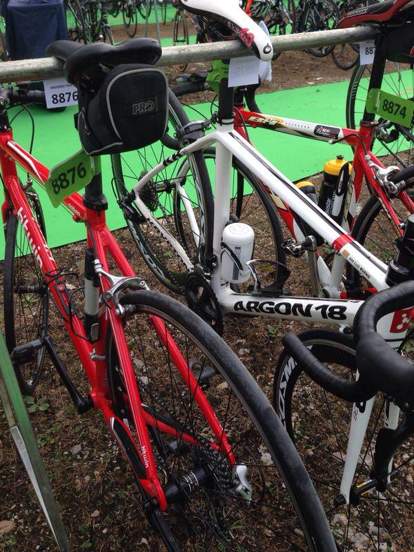 Después de comer recogemos los dorsales (esta vez si), y subimos de nuevo a Engolasters. Le ponemos las pegatinas a las bicis, inflamos ruedas y las dejamos en las perchas correspondientes. Allí empezamos a ver gente conocida. ¡¡Mola!! El ambiente del triatlón es diferente al del running. No os sabría decir porque, pero la verdad es que existe un postureo que no existe en el running. Los runners somos más de estar por casa. Aquí hay mucha apariencia y luego te llevas sorpresas. Eso si, gente majísima. ¡¡¡Y que coño!!! ¡¡El que diga que no le gusta el postureo miente!! 😉