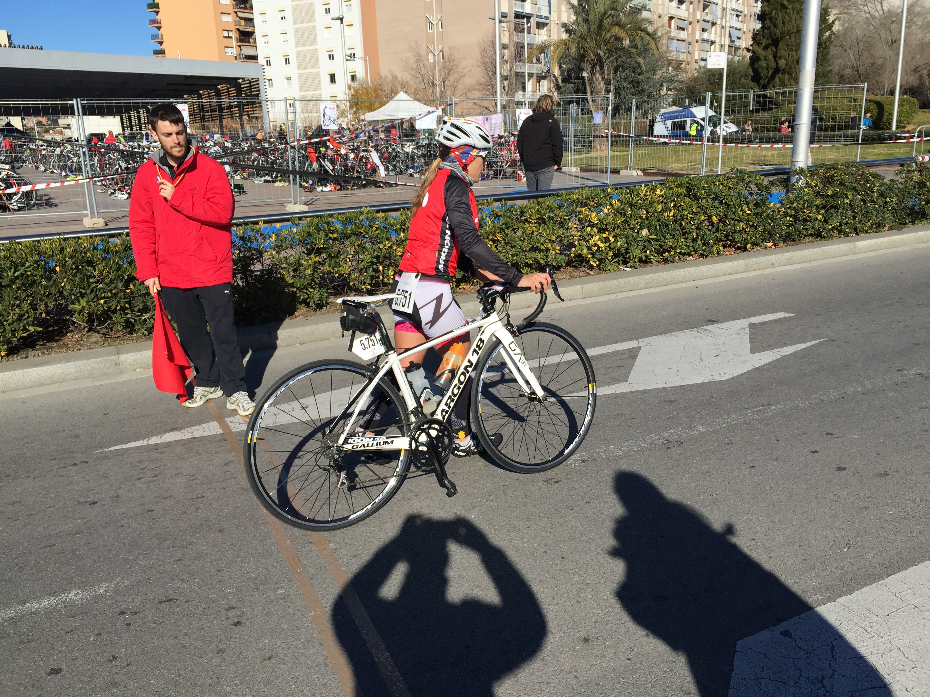 En la transición para la bici, me comenta Mireya que esta con el estómago «raro», pero se cambia las zapas y sale con la bici. Hace algo más de viento y me voy directo a la zona cercana donde darán la vuelta para hacer la segunda parte de la bici. Pasa en unos 45 minutos diciéndome que tiene rampas en los gemelos. Ya le pasó en la Cinc Cims, pero continúa y comienza la segunda vuelta. Le digo que se deje caer hasta que la atrape algún grupo que venga por detrás, para poder coger una rueda y dejarse llevar un poco. Los de delante se le han ido, pero conociendo lo cabezona que es, seguro que ha tirado sola.