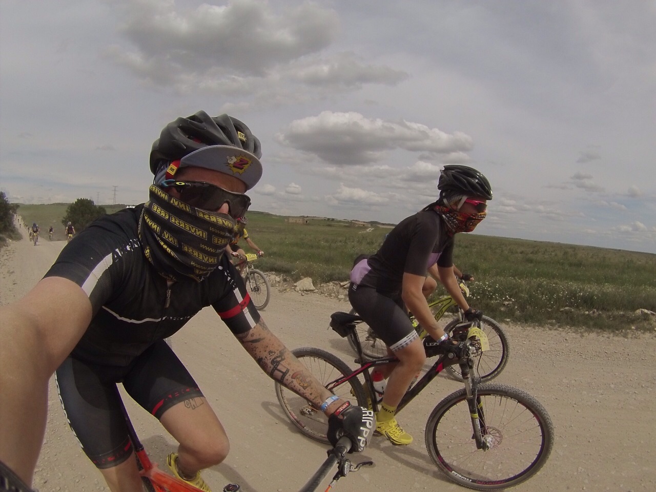 Cuando dan la salida, tardamos unos 15 minutos en pasar por el arco de meta. ¡¡Empezamos!! Este año salimos del pueblo sin poner el pie en el suelo. Cruzamos todo el pueblo sin prisa, pero sin pausa. Empezamos a rodar por tierra y vemos que este año también será mucho más polvoriento. No hay charcos pero si mucho polvo. De nuevo nos sorprende el número de caídas. Desde el principio. Caídas y pinchazos. Vamos bien. Nos adelantan Borja Estrada y Merce Sanjuan sobre el kilómetro 20. Voy pendiente de Mire. Solo ha cogido la BTT 3 días. En las bajadas voy más rato mirando atrás a ver como va, que mirando al frente.