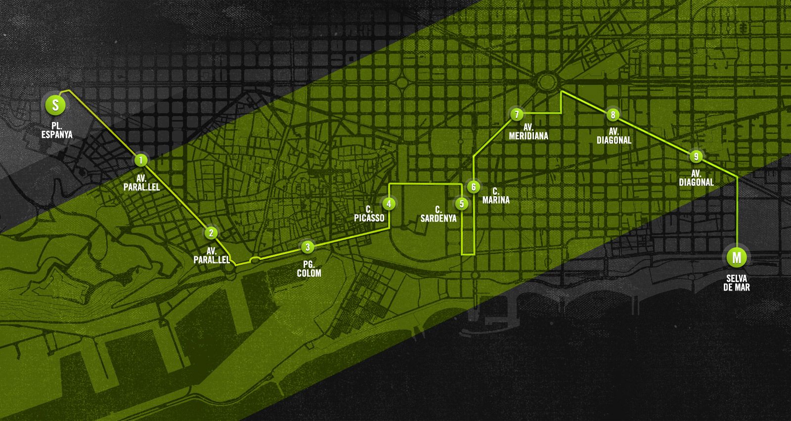 Salimos de Plaza España y BAJAMOS por Paralelo. Ojo con correr a un ritmo que no es el nuestro, que nos conocemos… Siempre pasa lo mismo. Nos envalentonamos y acabamos el primer kilómetro por debajo del tiempo al que teníamos previsto, y luego lo pagamos a media carrera. Déjate llevar, pero sin pasarte. A partir del final de Paralelo, un tramo largo y plano hasta bordear por completo el Parque de Ciutadella. Llegamos a Sardenya, donde nos encontraremos una pequeña subida y luego ya Marina y Meridiana (en subida). Ya estamos sobre el kilómetro 7,5 cuando llegamos a Bolivia y cogemos de Diagonal en una larga recta y así hasta Selva de Mar, donde nos encontraremos una recta de meta bastante larga.