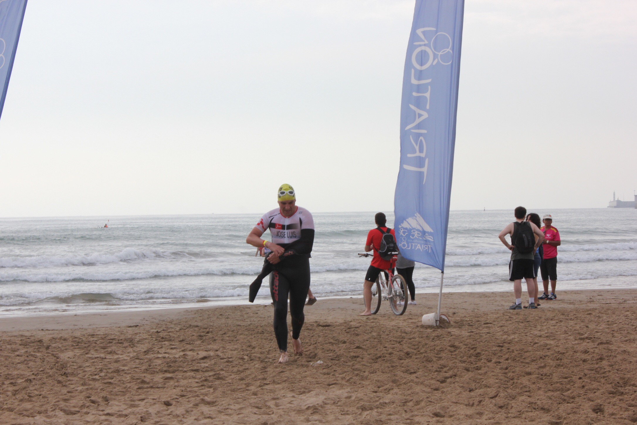 Los primeros 30 o 40 metros son corriendo. La profundidad es poca y no se puede nadar todavía. Al empezar a nadar, me centro en coger mi ritmo. No tengo prisa. Si paso el corte bien, y si no lo paso, pues a almorzar con Mire. No me pongo nervioso, aunque las nauseas siguen ahí. Voy avanzando bien y veo que llevo a gente a los lados y detrás. Incluso pasada la primera boya, adelanto a gente que ha salido antes que yo. Entre la primera y la segunda boya me tengo que parar, porque no me oriento. Levanto la cabeza y veo la boya. Me fijo donde está el sol y observo donde tengo «que verlo» mientras nado. De todas formas, me desvío de nuevo y tengo que rectificar. A por la tercera boya. Ahora a nadar de cara a la playa. El mar está cada vez peor. Me molesta la espalda… Mala señal. Voy casi todo el rato con dos triatletas, uno a cada lado, que incluso podría adelantar, pero prefiero quedarme con ellos para «orientarme». Cuando las olas empiezan a hacer acto de presencia, pienso que ya he llegado, pero cuesta bastante llegar a la arena.
