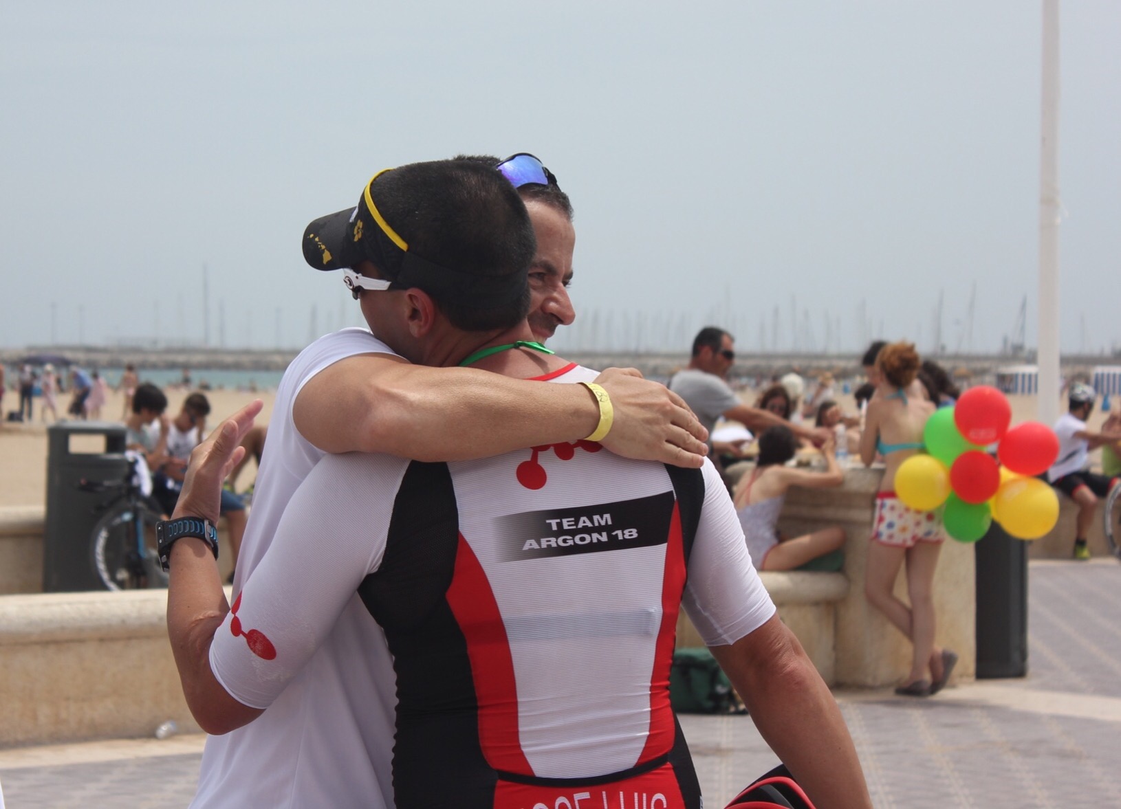 Pero hagamos un pequeño análisis. No soy un triatleta común. No tengo un físico atlético, no vengo de la natación, no entreno ni la mitad de lo que otros compañeros entrenan. Soy lento corriendo, malo nadando y en la bici del montón. Pero hay algo que me ayuda: Me gusta el triatlon. El ambiente que se vive en la previa y durante la prueba. La preparación previa, los ánimos de los compañeros con los que te cruzas durante la prueba, esa superación sobre uno mismo, mejorando los tiempos en cada distancia, incluso en la transición. También ese punto de sufrimiento que hace que cruzar la meta sea una hazaña, aunque lo hagas 2 horas después del primero. Si es cierto que paradójicamente, ahora entreno mucho más que antes, y que las condiciones de ayer en Valencia, en especial en el mar y en lo referente a la humedad y el calor, aumentaron la dureza de la prueba.