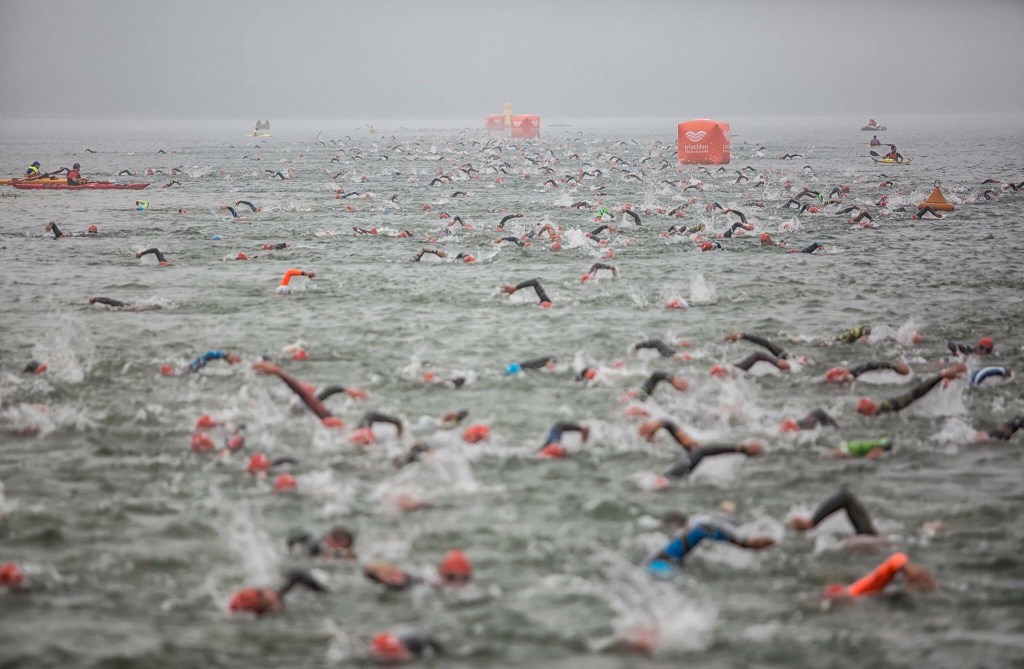 15 minutos después, nos llaman a los del FULL para que vayamos a la salida. Justo en ese momento vemos a los primeros del HALF que ya están a punto de llegar a la «playa». ¡Como nadan! Curiosamente, estoy bastante tranquilo. El retraso en la salida me ha ido bien para templar los nervios y concentrarme. Nunca he nadado 3,8kms, pero si 1,9. Aquí el recorrido consta de 2 vueltas de 1,9kms, así que es algo que ya he hecho más veces y pensar así me ayuda a tranquilizarme.