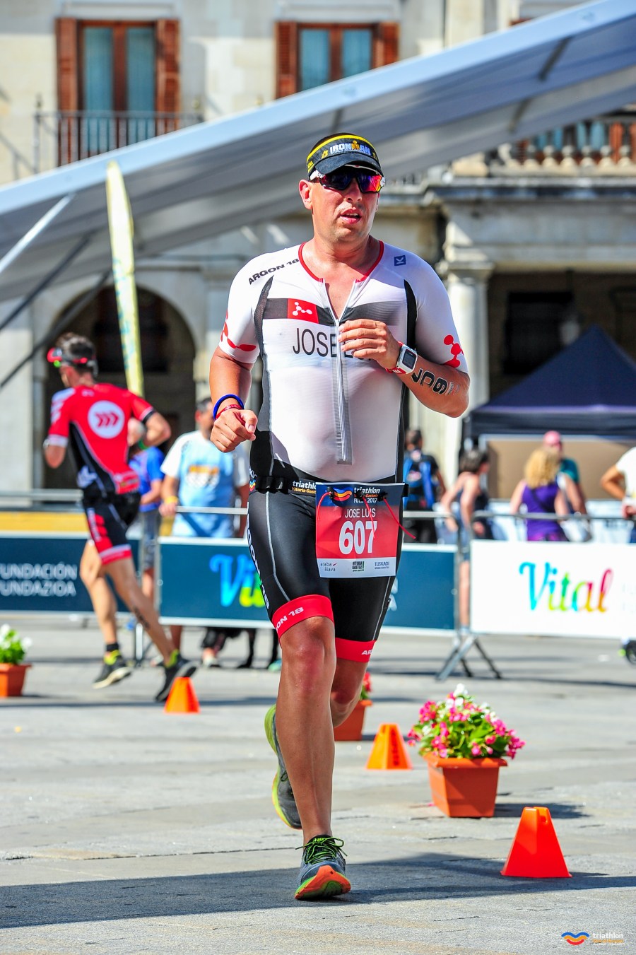 Al llegar a Vitoria los 2 kilómetros por la ciudad son un infierno. El calor, el cansancio y las ganas de bajarme del potro de tortura, hacen que esos 2 kilómetros se me hagan larguísimos. Me bajo de la bici, se la entrego al voluntario y me voy con las zapas en la mano a la T2 (no sé bajarme de la bici en marcha y prefiero no arriesgar pegarme una nata…). Busco a Mire pero no la veo (o sí, no lo recuerdo). Me pongo las zapas de run, la visera y voy caminando al WC. Ya llevo unas 7 horas y cuarto de carrera y toda el agua que he bebido la tengo que sacar, a pesar de haber sudado bastante. Pero los WC de la T2 están llenos y decido seguir corriendo y parar en los siguientes.