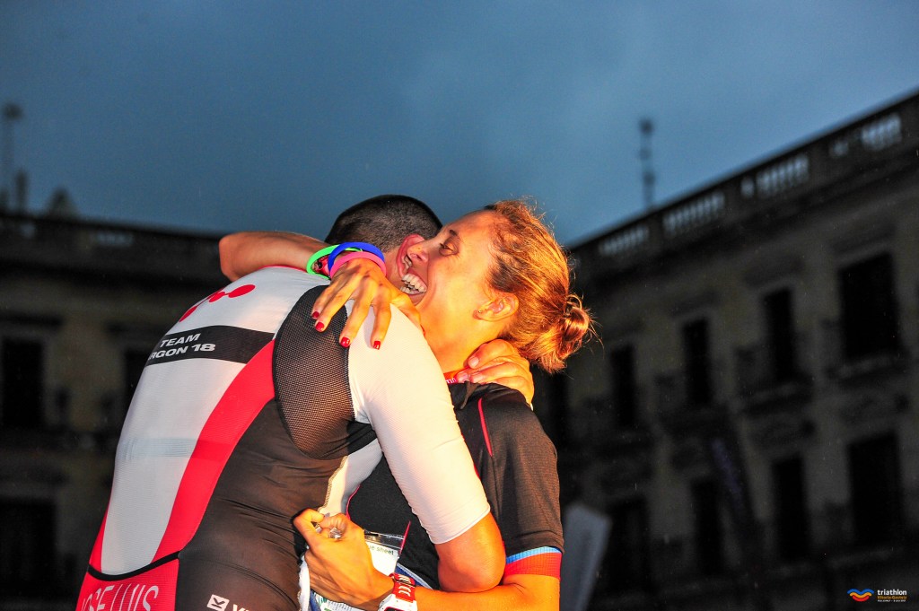 La última vuelta es horrible. Larga, pesada, con menos gente animando y además amenaza tormenta. Se escuchan los truenos y se oscurece la ciudad. Sigo a lo mío y me voy acercando poco a poco a meta. Los últimos 2 kilómetros, tal vez los más pesados por los “ida y vuelta” del circuito, se me hacer interminables. Pero al llegar al parque sé que lo conseguiré. Empieza a llover un poco. Quedan solo 500 metros para conseguir se “finisher” de mi segundo Ironman… Y sí, los 200 metros de la entrada en meta no los olvidaré. Me pongo a llorar como un niño de la emoción. Solo los que lo sufrimos, sabemos lo que es una prueba de estas características. Lloro de felicidad, de nervios y de orgullo, porque no decirlo. Solo espero ver a Mire en meta para ver como le ha ido. Los 20 metros de la recta de meta, con el reloj diciéndome que llego en 12 horas 28 minutos ¡son puro éxtasis! Me llevo las manos a la cabeza y rompo a llorar. En meta, Mire me está esperando y me abraza. ¡Ha quedado tercera de su categoría! ¡¡Eres muy grande cielucho!! #ProudOfYouVikinga