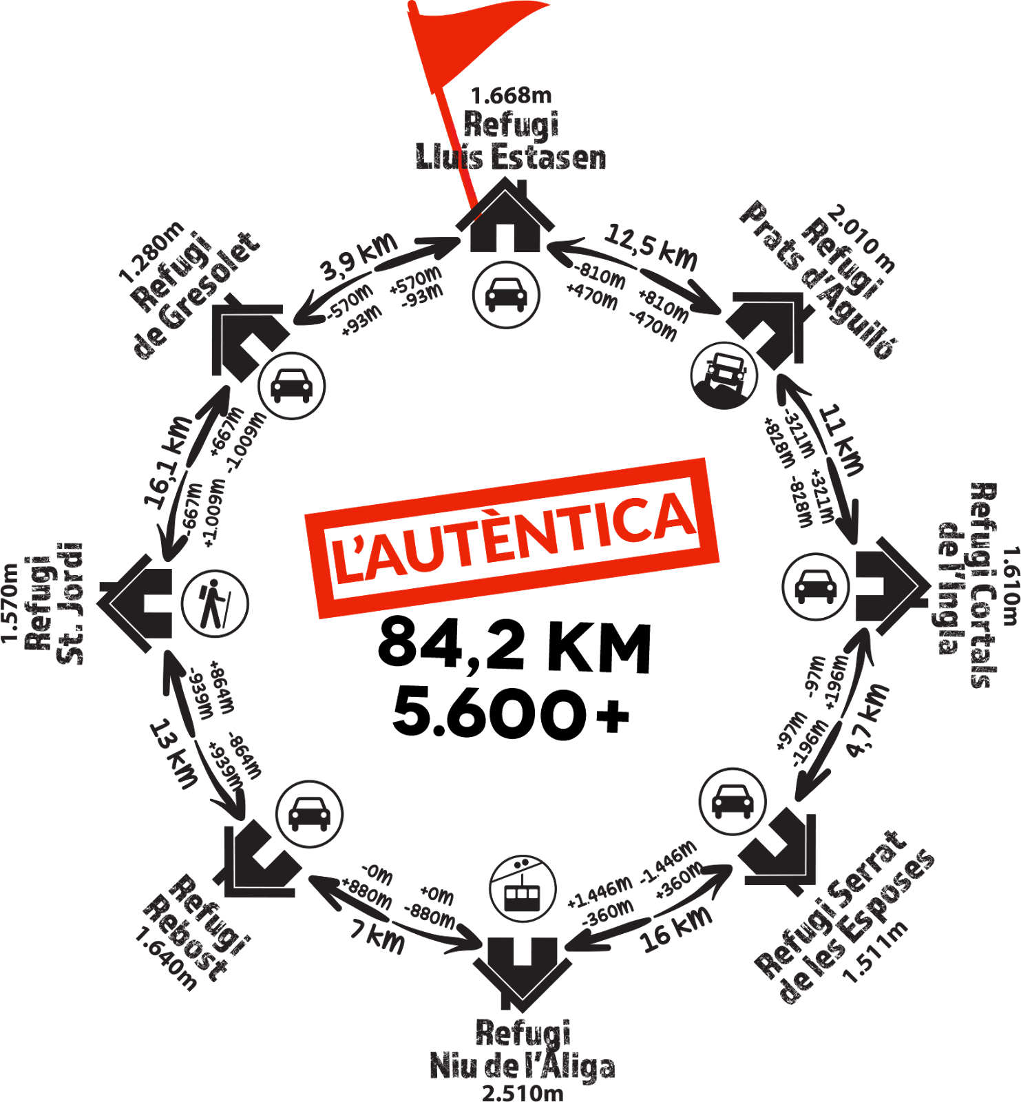 Son un total de 82kms con un desnivel acumulado de 10.000 metros, siendo el punto más alto la cota de 2520m en el Refugi Niu de l’Áliga.