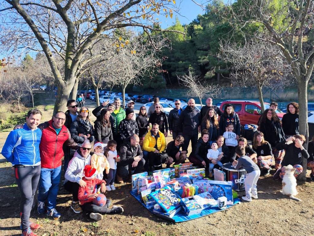 Mientras un grupo reducido (muy reducido este año) se iba a correr, el resto nos quedamos recibiendo a los primeros amigos que venían con sus juguetes. A cada uno se le daba un número para el sorteo de material que cuando volviesen los corredores, haríamos como cada año. Este año el sorteo tenía como regalos estrella unos relojes inteligentes que nos proporcionó Mari Carmen de KINYO y una inscripción a un triatlón, a elegir entre las 4 distancias que hay, que organizan los amigos de la empresa TRADEINN, en Celrà (Girona) y que se celebra en Platja d’Aro en el mes de mayo. Todo un desafío para quien fuese el afortunado, aunque evidentemente podría cedérselo a quien quisiera. También «resorteamos» un mini tatuaje que hará nuestro amigo Enric. Aquí el agraciado fue Pere, que ya sabe lo que es pasar por la tinta de Enric.